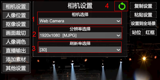 1.相机设置 2.人像位置 3.抠像设置 4.直播输出